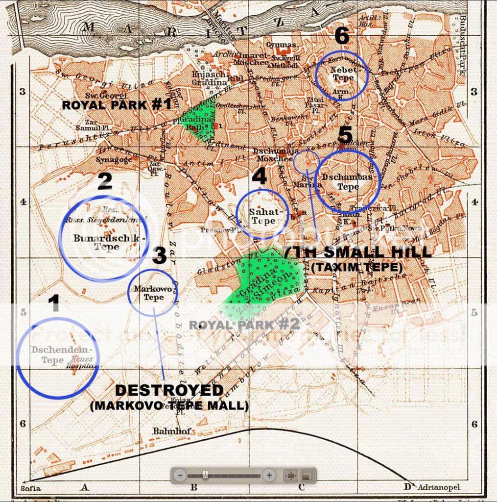 The city if Plovdiv had been inhabited for c. 8000 years and is regarded as the 6 oldest city on Earth. ref1 ref2 ref3 It was possibly chosen for its 7 natural hills or seven Tepes that became the 7 historical hills of the city and ultimately forwarding this tradition to Rome, Athens, Istanbul, Bonn, Vilnius and a number of cities around the world. ref - it was included in their coat of arms too, see an image here. Like in other cities, the hills of Plovdiv are naturally situated in the general layout of the 7 stars of Pleiades and represent 'the heaven', as above so below pattern. Its importance recognized 8000 years ago, the Pleiades hills were expanded in the 19th - 20th centuries by the elite - constructions including a major pathway like a causeway leading to the now abandoned Brothers' monument that looks like a tiny star from above, built to symbolise an ancient mound in the shape of a wreath, possibly for a reason to imitate something that has to do with a great ancient secret. ref1 ref2 ref3